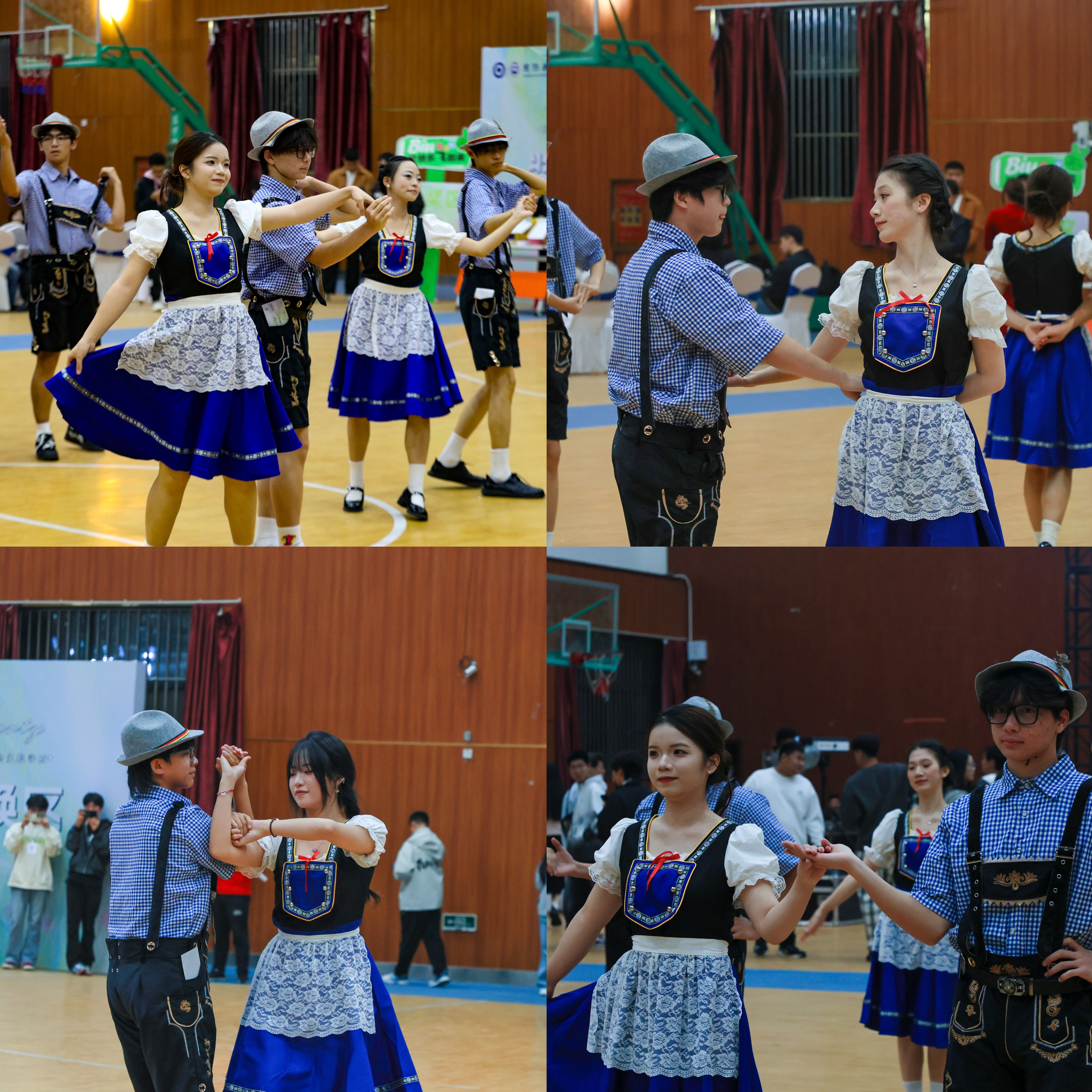 音乐响起,10位同学身着奥地利传统服饰惊艳登场。他们随轻快的节奏精准踏步,动作整齐划一。男女舞伴间眼神交流默契,在牵手、绕圈与换位间,将连德勒舞的欢快与活力展现得淋漓尽致。