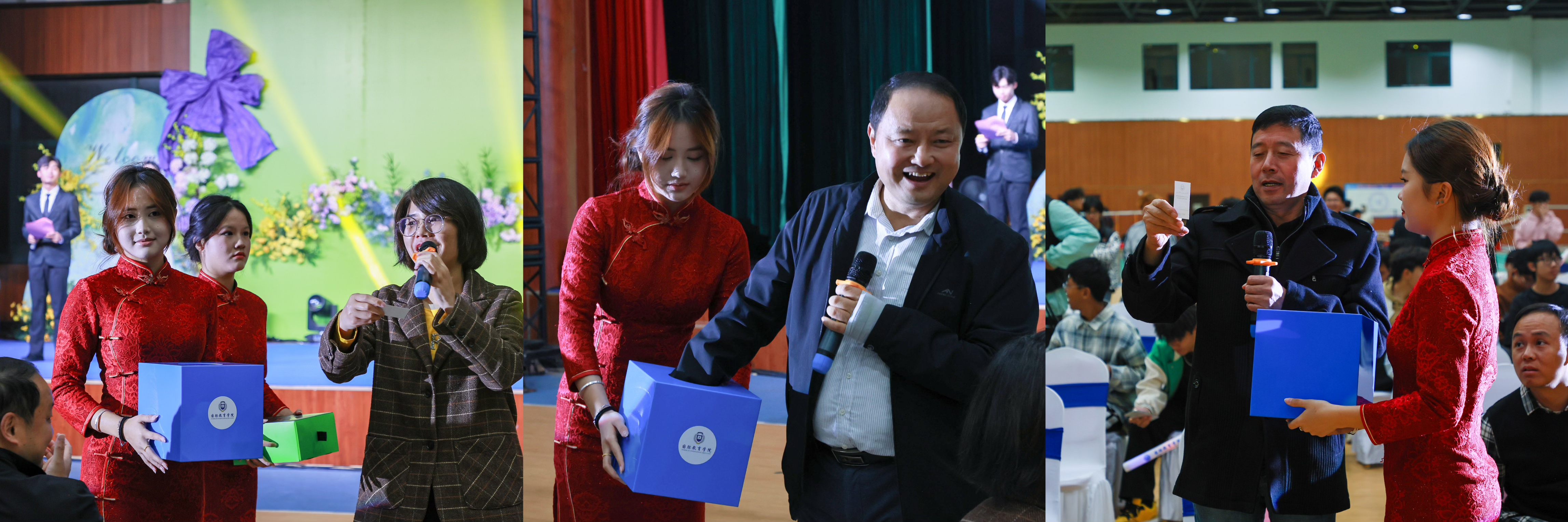 整场晚会的高潮莫过于三轮扣人心弦的幸运大抽奖:后勤保卫处钟木生处长开启的首轮维纳斯氛围灯瞬间点燃全场期待;随后校长助理方兵抽取的环游世界巧克力将气氛推向新高;最终,副校长鲜丽揭晓的雷蛇耳机大奖,更在屏息与欢呼中为夜晚增添了最难忘的亮色。